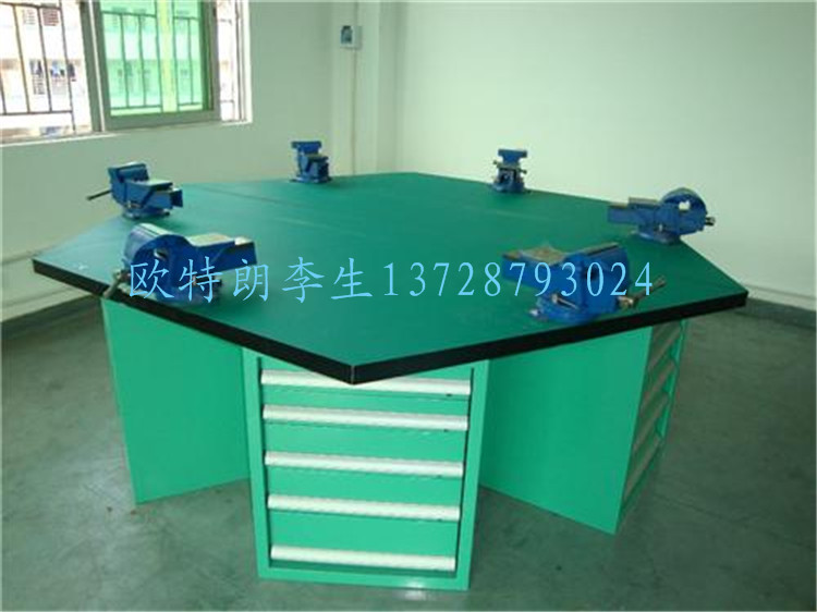六角工作台拥有六个工位,占地面积小,非常适合钳工学校工厂的钳工实训、钳工操作;标准高度为800mm,单边长1.2米,直径2.4米,适合中国工人的身高和工作效率,六角钳工工作台:又称为钳台,主要分为钳工装配平台,钳工划线平台,钳工检验平台。