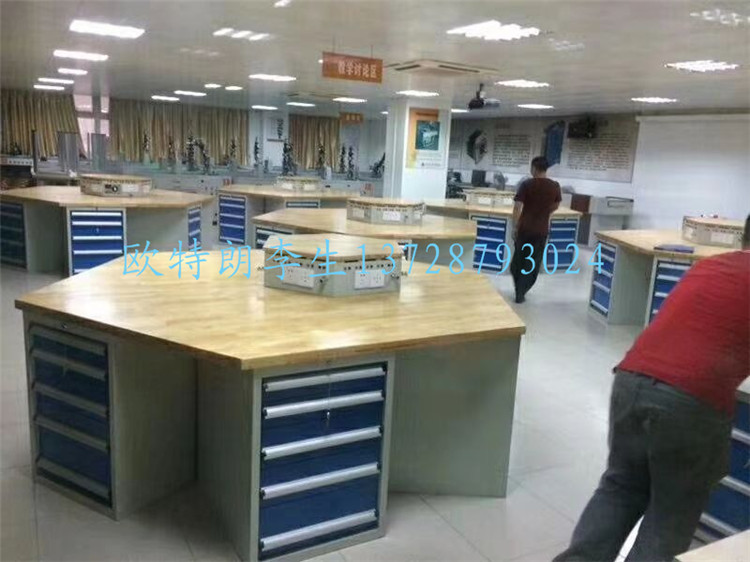(2)柜子材料1.0厚的四个抽屉,定制实训六角工作台,单轨每只抽屉均承重50公斤,台面均承重600公斤.