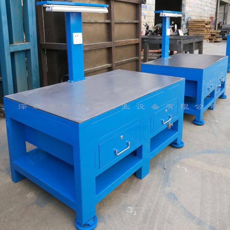 钢板工作台桌面主要由A3或45#钢板制作,经大水磨处理,桌面平整光滑美观!桌面钢板厚度主要有10mm、15mm、20mm、30mm可选,按客户的承重要求来选择!